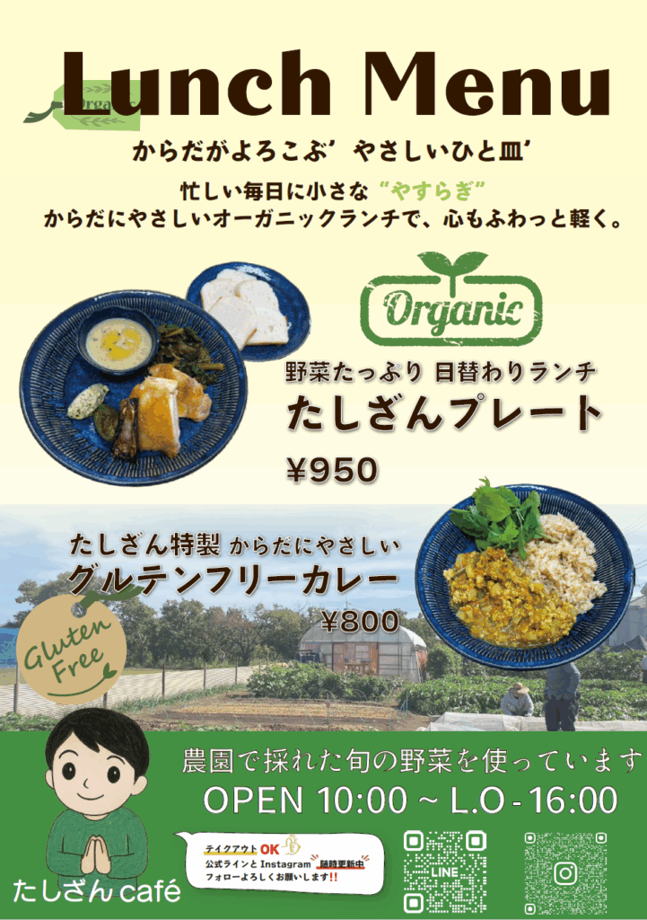 パン工房(ふくしパン工房たしざん) グルテンフリー専門店・ノウフクカフェ出会えた完全無農薬米粉・・・その素材の良さを引き出すために・・・パンやシフォンケーキの美味しさを追求して・・ふくしパン工房たしざんでは障がいをお持ちの方が主役のお店で、グルテンフリーで無添加の米粉パン・米粉シフォンケーキ・米粉クッキーを製造しています。この売上と利益はすべてここで働いている障がいをお持ちの方の 方の工賃(給与)となります。 製造している人が楽しく、安心して、おいしく食べられるものを製造しています。同じ作業所の農耕班の畑でとれた自然栽培の野菜を練りこんだ野菜パンや野菜クッキーもオリジナル商品です。 たしざん福祉作業所でのお仕事 より高みへリニューアルたしざんのパンは、完全無農薬米粉(京都産ミズホのチカラ)、白神こだま酵母(生)、有機砂糖、有機ココナッツオイル、天然塩(海の塩)といった、こだわりの有機素材で製造しています。同じく全て有機素材で製造した「奇跡の米粉クッキー」もぜひお試しください。お子様、高齢者の方、健康志向の方、ご病気をお持ちの方などがリピーターさんです。香りのよい、身体にも癒しにも素敵なグルテンフリーのたしざん製品ぜひご賞味ください。 利用者さんが分担して作業・計測する方・生地を混ぜる方・分配する方・成形する方・洗い物をする方・モップをかける方厨房班の利用者さんが主体的に行っています。 乾燥野菜の加工たしざん畑で収穫した野菜(なす・きゅうり・トマト・ゴーヤ・ピーマンなど)を乾燥加工して販売しています。お味噌汁や炒め物・酢の物・ふりかけ・野菜マヨネーズ・野菜ポタージュに適しています。 ノウフクカフェたしざん畑で収穫した自然栽培乾燥野菜をベースとしたグルテンフリーカレーやハーブティーをお召し上がり頂けます。コーヒーもドリップで淹れています。グルテンフリー弁当(価格:税込み950円)も販売しています。 カフェスペースリニューアルより落ち着いた雰囲気でおくつろぎいただけるよう、カフェスペースをリニューアルしました。 ノウフクカフェ 事業所名たしざん相談支援ステーション 所在地〒178-0063東京都練馬区東大泉7-46-14 電話番号03-6316-9541 FAX03-6767-9882 受付時間9:00~15:00 お問合せ ノウフクカフェメニュー